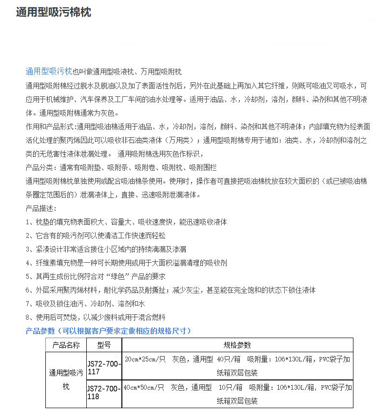 ·枕垫的填充物表面积大、容量大、吸收速度快,能迅速吸收液体 ·它含有的吸污剂可以使清洁工作快速而轻松 ·紧凑设计非常适合接住小区域内的持续滴漏及渗漏 ·纤维素填充物是一种可长期使用或用于大面积溢漏清理的吸收剂 ·其再生成份比例符合对“绿色”产品的要求 ·外层采用聚丙烯材料,耐化学药品及耐撕扯;减少灰尘,甚至能在完全饱和的状态下锁住液体 ·吸收及锁住油污、冷却剂、溶剂和水 ·使用后可焚烧,以减少废料或用于混合燃捷料斗