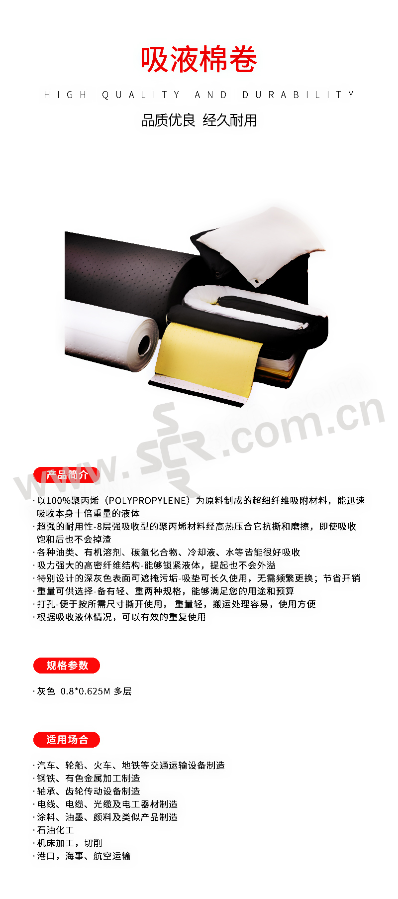 ·以100%聚丙烯(polypropylene)为原料制成的超细纤维吸附材料,能迅速吸收本身十倍重量的液体·超强的耐用性-8层强吸收型的聚丙烯材料经高热压合它抗撕和磨擦,即使吸收饱和后也不会掉渣·各种油类、有机溶剂、碳氢化合物、冷却液、水等皆能很好吸收·吸力强大的高密纤维结构-能够锁紧液体,提起也不会外溢·特别设计的深灰色表面可遮掩污垢-吸垫可长久使用,无需频繁更换;节省开销·重量可供选择-备有轻、重两种规格,能够满足您的用途和预算·打孔-便于按所需尺寸撕开使用, 重量轻,搬运处理容易,使用方便·根据吸收液体情况,可以有效的重复使用
