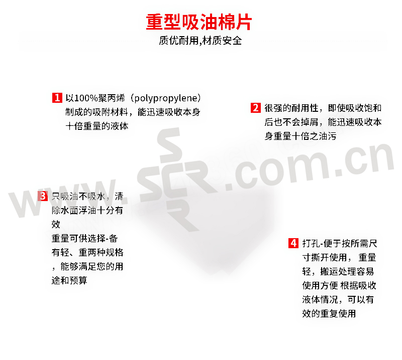 ·以100%聚丙烯(polypropylene)为原料制成的超细纤维吸附材料,能迅速吸收本身十倍重量的液体