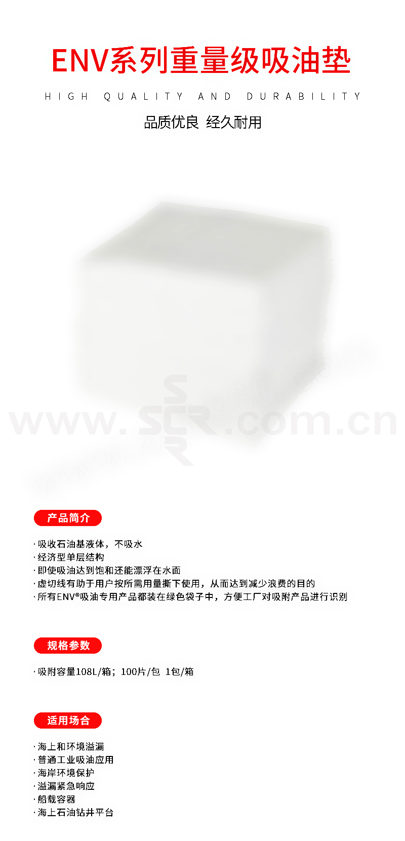 ·吸收石油基液体,不吸水·经济型单层结构·即使吸油达到饱和还能漂浮在水面·虚切线有助于用户按所需用量撕下使用,从而达到减少浪费的目的·所有ENV®吸油专用产品都装在绿色袋子中,方便工厂对吸附产品进行识别