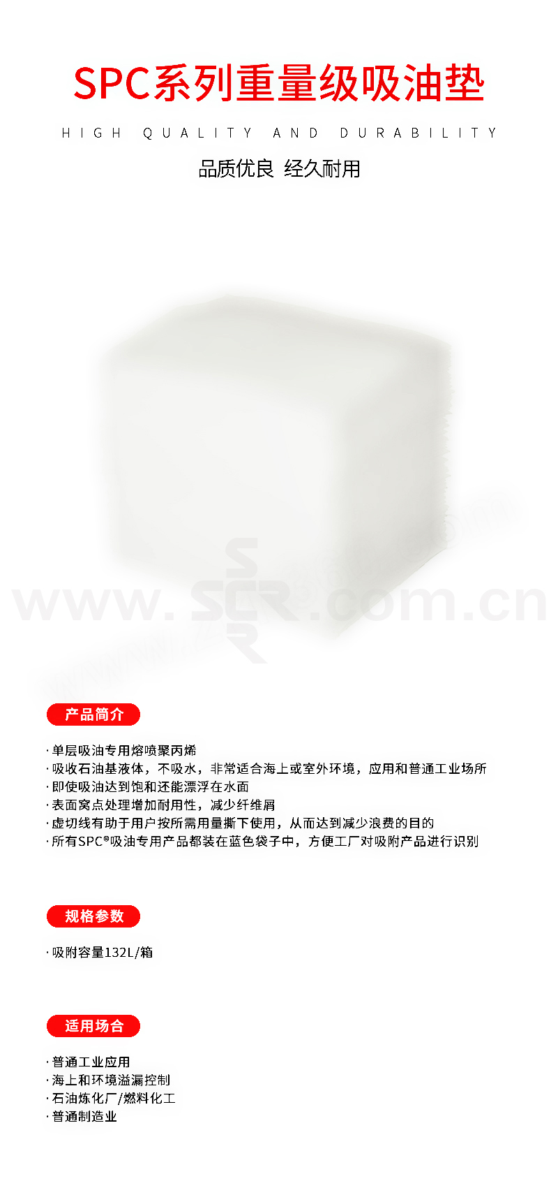 ·单层吸油专用熔喷聚丙烯·吸收石油基液体,不吸水,非常适合海上或室外环境应用和普通工业场所。·即使吸油达到饱和还能漂浮在水面·表面窝点处理增加耐用性,减少纤维屑·虚切线有助于用户按所需用量撕下使用,从而达到减少浪费的目的·所有SPC®吸油专用产品都装在蓝色袋子中,方便工厂对吸附产品进行识别