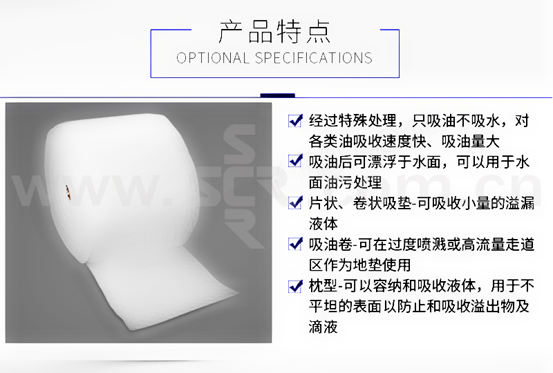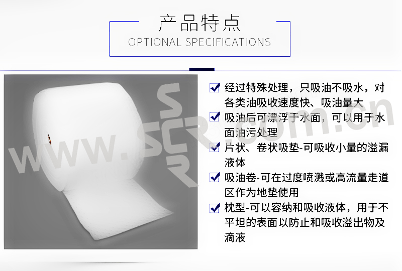 ·经过特殊拒水处理,只吸油不吸水,对各类油吸收速度快。吸油量大·吸油后可漂浮于水面,可以用于水面油污处理·片状、卷装吸垫可吸收小量的溢漏液体·卷状可在过度喷溅或高流量走道区作为地垫使用,具有耐磨性能的上层可将水分吸收到下层中去,防止走道湿滑及有害液体污染,保持工作场地清洁、安全·有分割虚线,取用方便·枕形可容纳和吸收液体,用于不平坦的表面以防止和吸收溢出物及液滴·条形可用做围栏,吸收并防止油污扩散·适用于水面浮油处理
