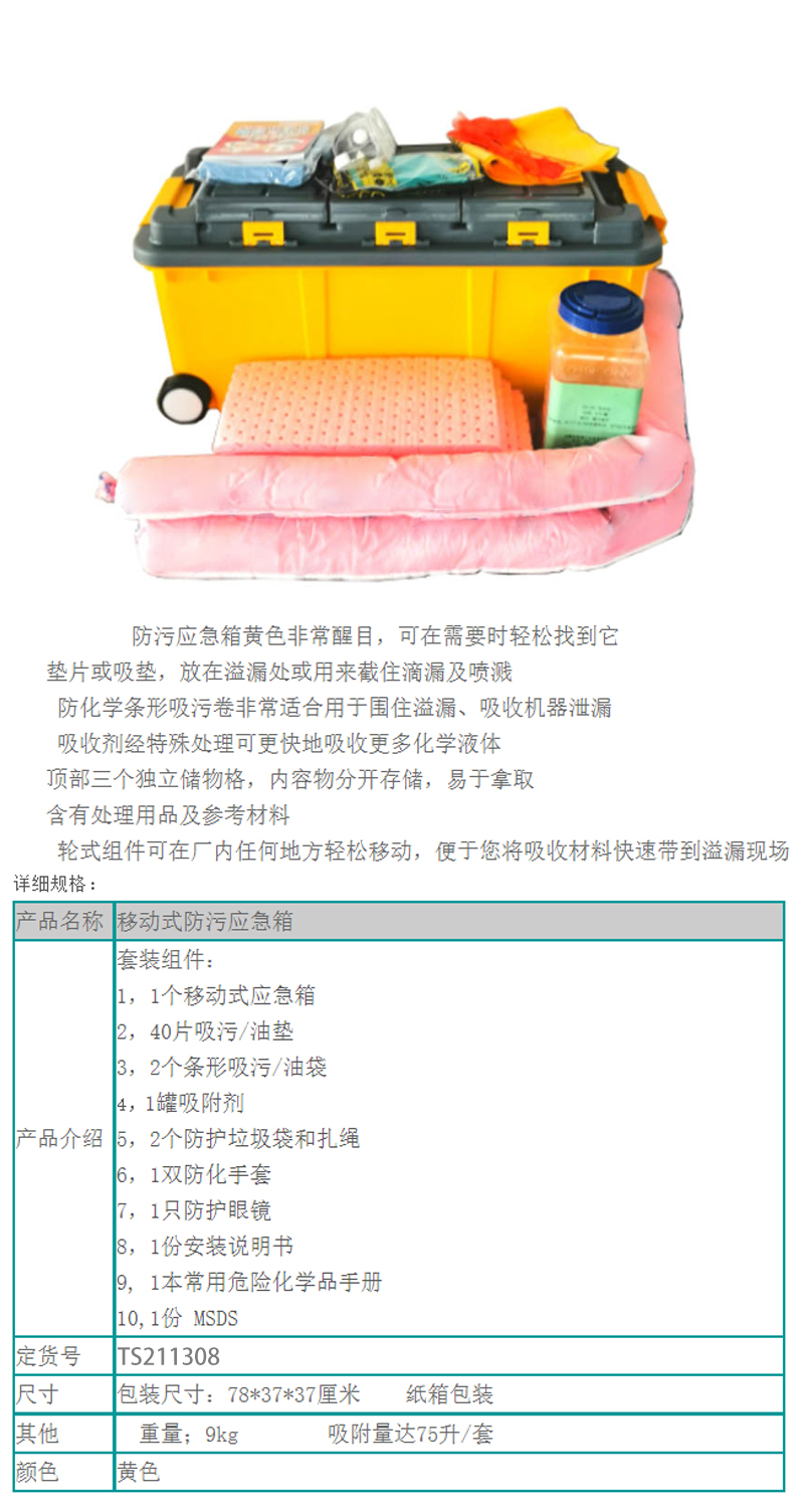 ·便携式防污应急包,内装常用吸附材料,便携易带,适合工厂溢漏事故的应急处理。本套装体积小。