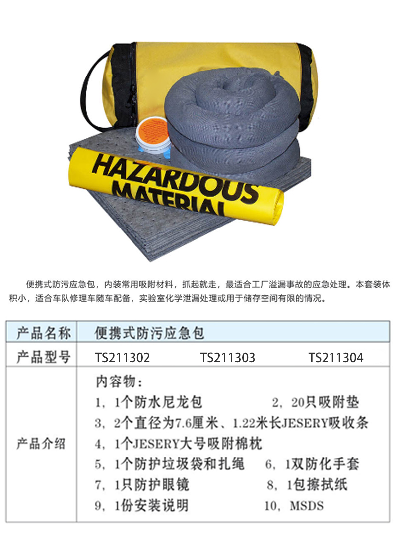 ·便携式防污应急包,内装常用吸附材料,便携易带,适合工厂溢漏事故的应急处理。本套装体积小。