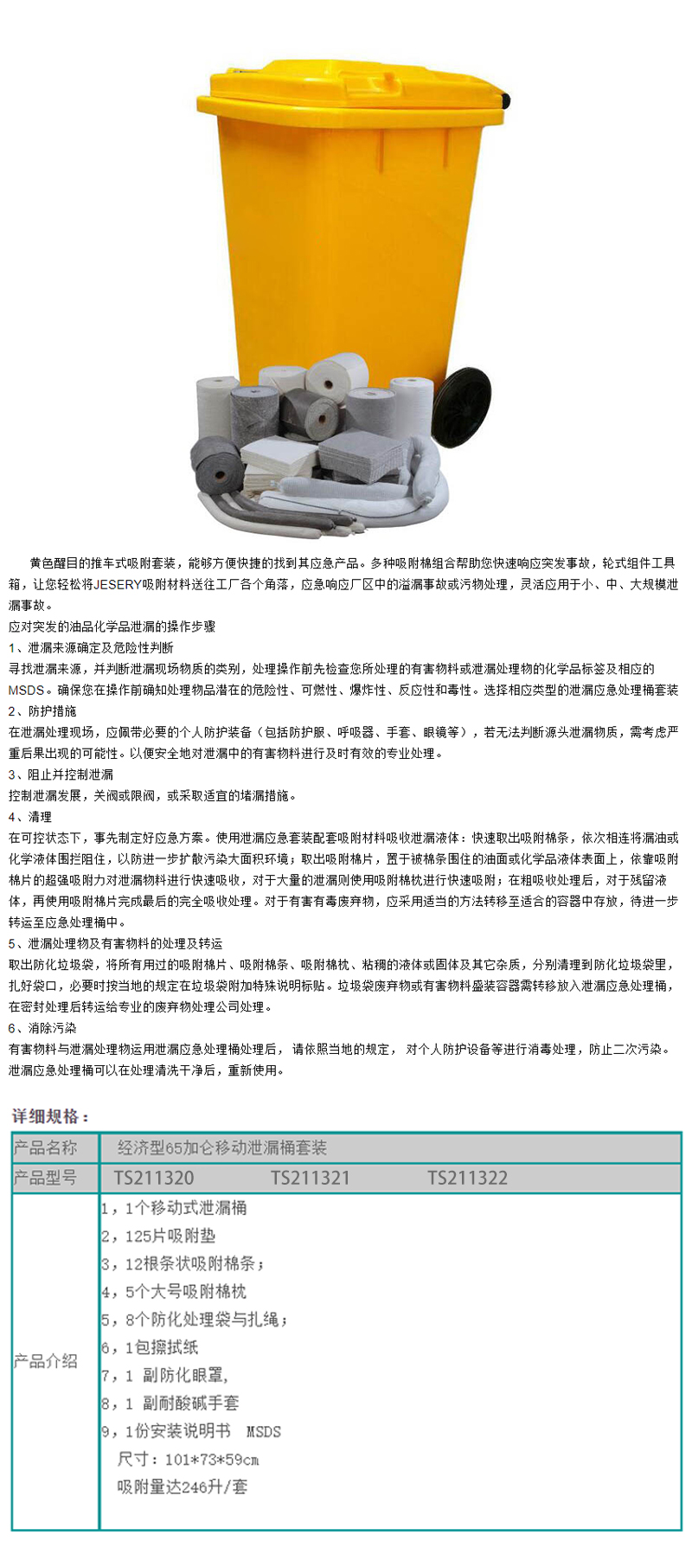 ·泄漏应急处理桶里包含相应的泄漏应急处理材料,分成吸油专用(油和碳氢化合物液体)、通用型(油、水和化学物质)和化学吸液型(化学品,腐蚀性液体和危险 化学品)。条状、片状吸附棉按一定比例组合,加上超强吸附剂,再配备上相应的防护产品,使应对突发之泄漏更迅速有效