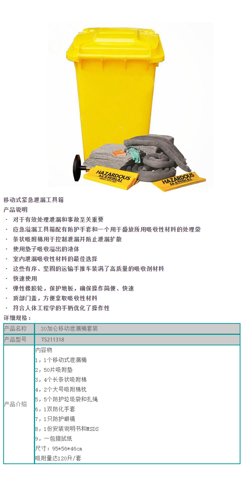 ·泄漏应急处理桶里包含相应的泄漏应急处理材料,分成吸油专用(油和碳氢化合物液体)、通用型(油、水和化学物质)和化学吸液型(化学品,腐蚀性液体和危险 化学品)。条状、片状吸附棉按一定比例组合,加上超强吸附剂,再配备上相应的防护产品,使应对突发之泄漏更迅速有效