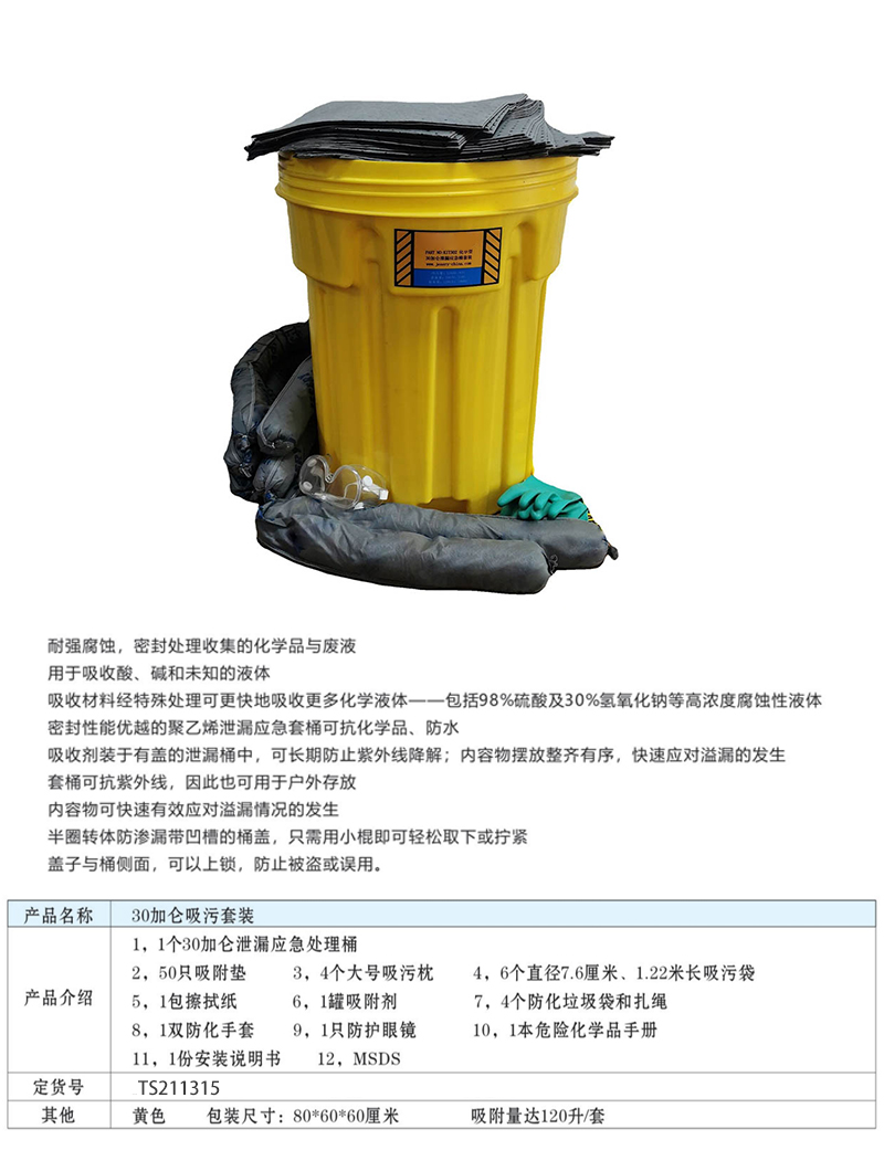 ·20gal便携式泄漏应急桶套装|便携式吸污套装 ·双耳设计方便搬运收集的化学废弃物 ·便携式桶盖便于紧急情况下迅速打开取出内置的应急材料