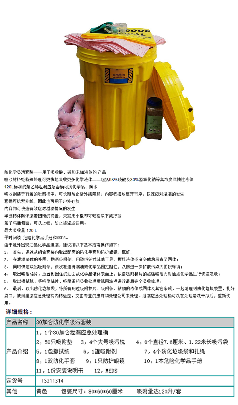 规格:  包装尺寸 80×60×60cm 黄色 吸附量达120升/套 制造商型号:  TS211314