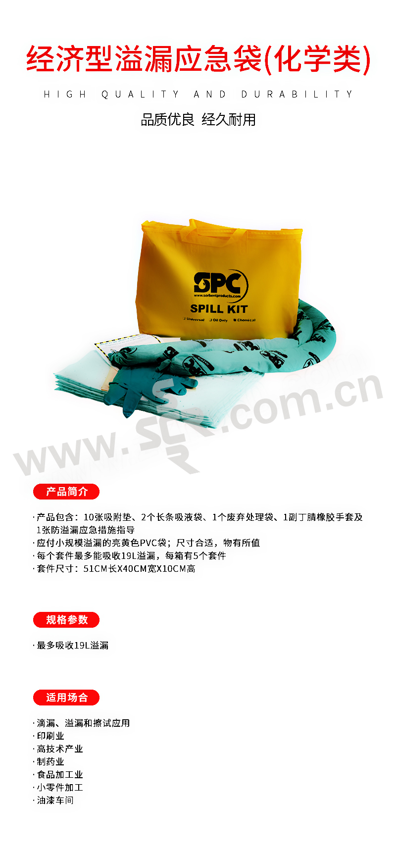 ·产品包含:10张吸附垫、2个长条吸液袋、1个废弃处理袋、1副丁腈橡胶手套及1张防溢漏应急措施指导