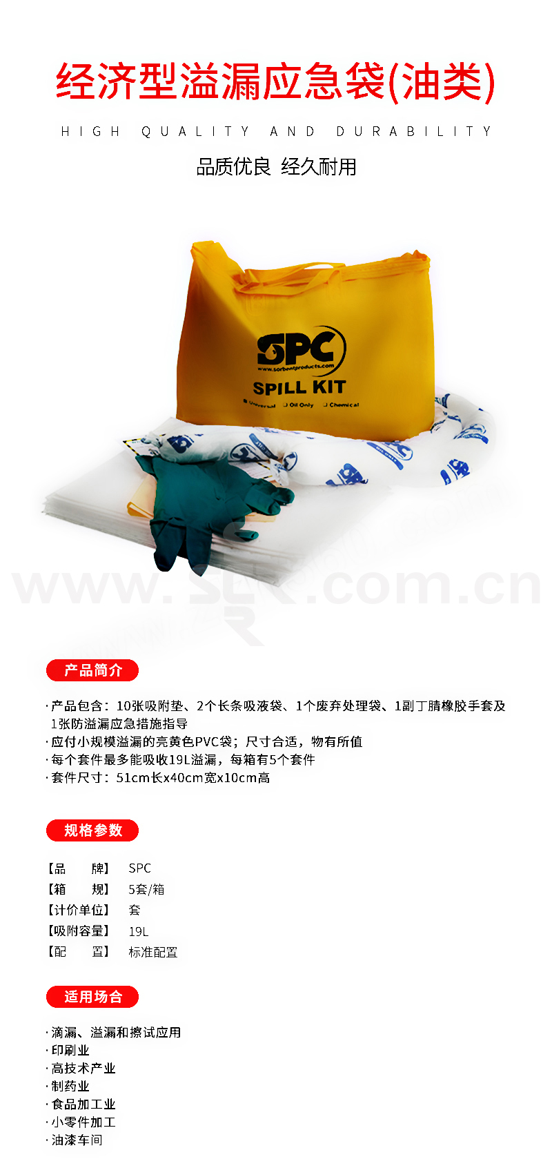 ·产品包含:10张吸附垫、2个长条吸液袋、1个废弃处理袋、1副丁腈橡胶手套及1张防溢漏应急措施指导·应付小规模溢漏的亮黄色PVC袋;尺寸合适,物有所值·每个套件最多能吸收19L溢漏,每箱有5个套件·套件尺寸:51cm长x40cm宽x10cm高