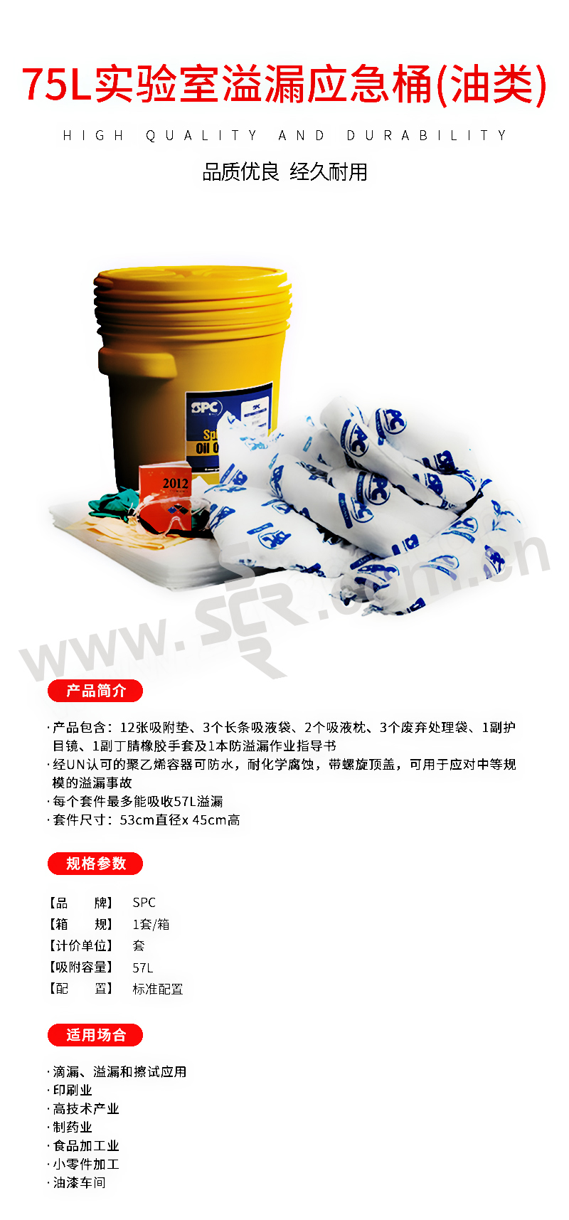·产品包含:12张吸附垫、3个长条吸液袋、2个吸液枕、3个废弃处理袋、1副护目镜、1副丁腈橡胶手套及1本防溢漏作业指导书