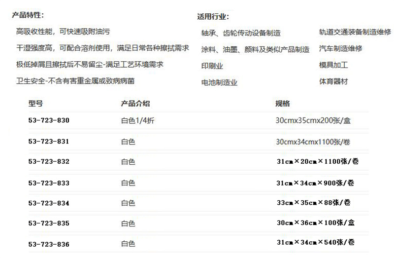 ·吸水、吸油性比传统的擦拭品好,吸附性高,提高擦拭效率; ·极低掉屑且擦拭后不易留尘,不褪色,不含硅树脂保证工艺安全,具有很高的抗拉耐磨强度。