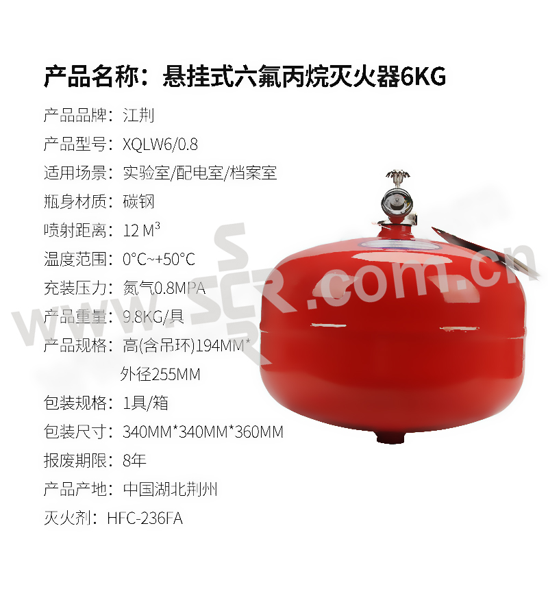 JIANGJING/江荆 悬挂六氟丙烷灭火器 XQLW6/0.8 灭火剂含量6kg 1个