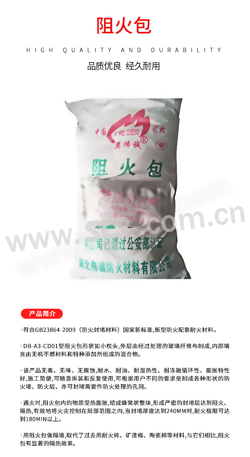 ·DB-A3-CD01型阻火包形状如小枕头,外层由经过处理的玻璃纤维布制成,内部填充由无机不燃材料和特种添加剂组成的混合物