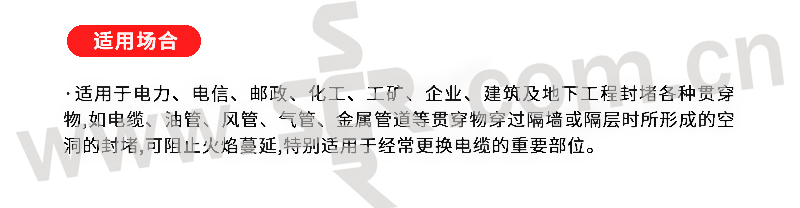 ·该产品无毒、无味、无腐蚀,耐水、耐油、耐湿热性、耐冻融循环性、膨胀特性好,施工简便,可随意拆装和反复使用,可根据用户不同的要求垒制成各种形状的防火墙、防火层、亦可封堵需要作防火处理的孔洞。