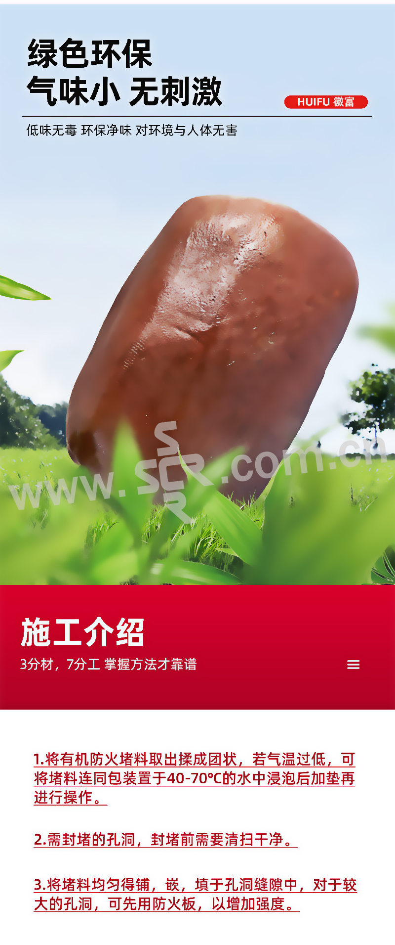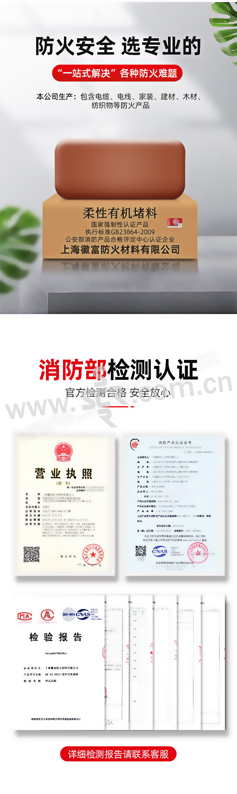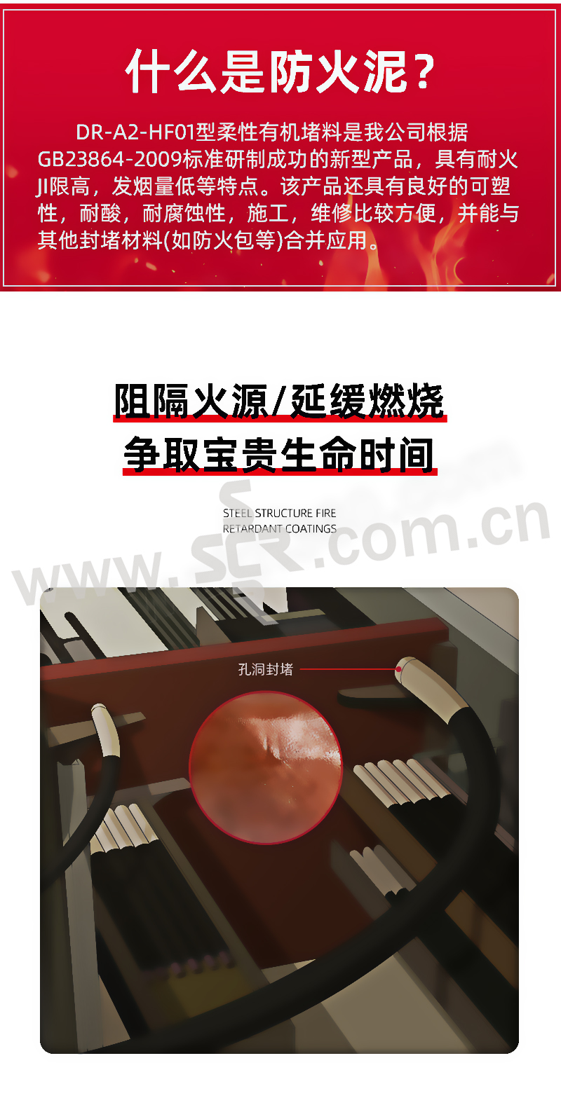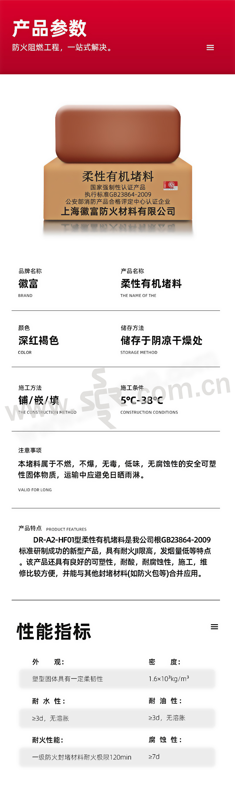 ·DR-A2-HF01型柔性有机堵料是我公司根据GB23864-2009标准研制成功的新型产品,具有耐火极限高,发烟量低等特点。·该产品具有良好的可塑性,耐酸,耐腐蚀性,施工,维修比较方便,并能与其他封堵材料(如防火包等)合并应用。