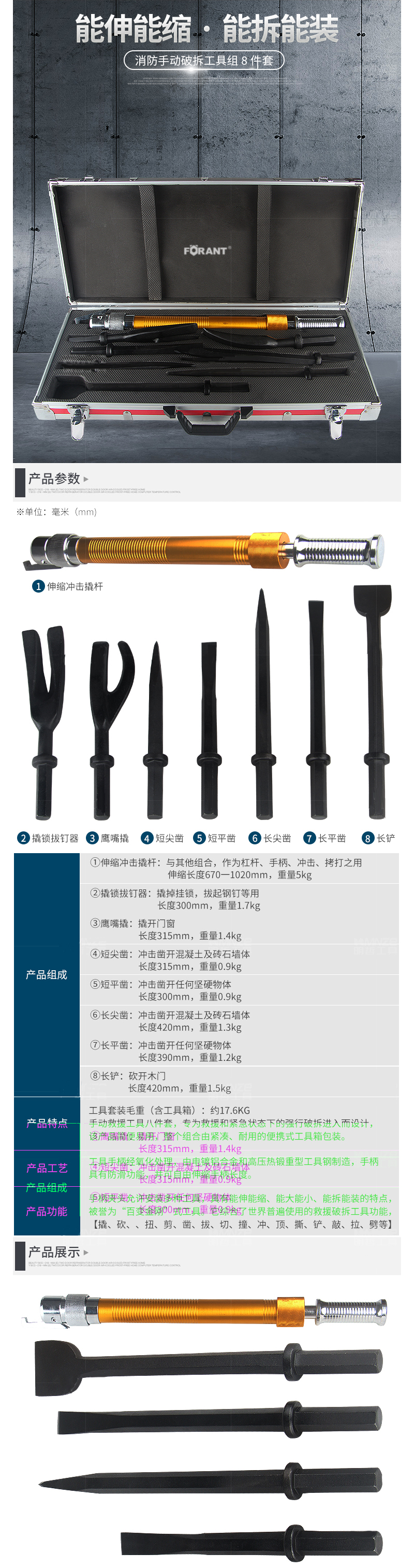 ·工具套装总重〔含工具箱)约17.6Kg ·手动救援工具8件套,专为教援和紧急状态下的强行破拆进入而设计 ·该产品简便易用,整个组合由紧凑、耐用的便携式工具箱包装