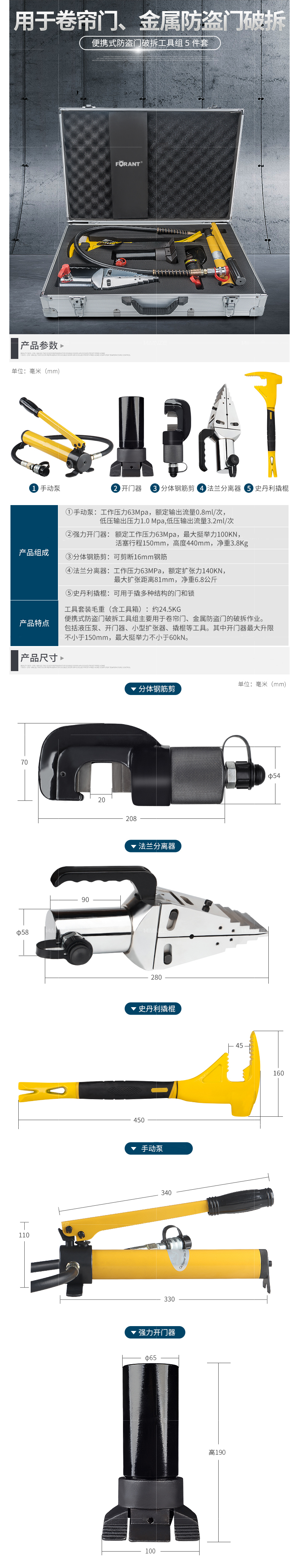 ·工具套装总重(含工具箱)约24.5Kg ·便携式防盗门破拆工具组主要用于卷帘门、金属防盗门的玻拆作业 ·该产品简便易用,整个组合由紧凑、耐用的便携式工具箱包装
