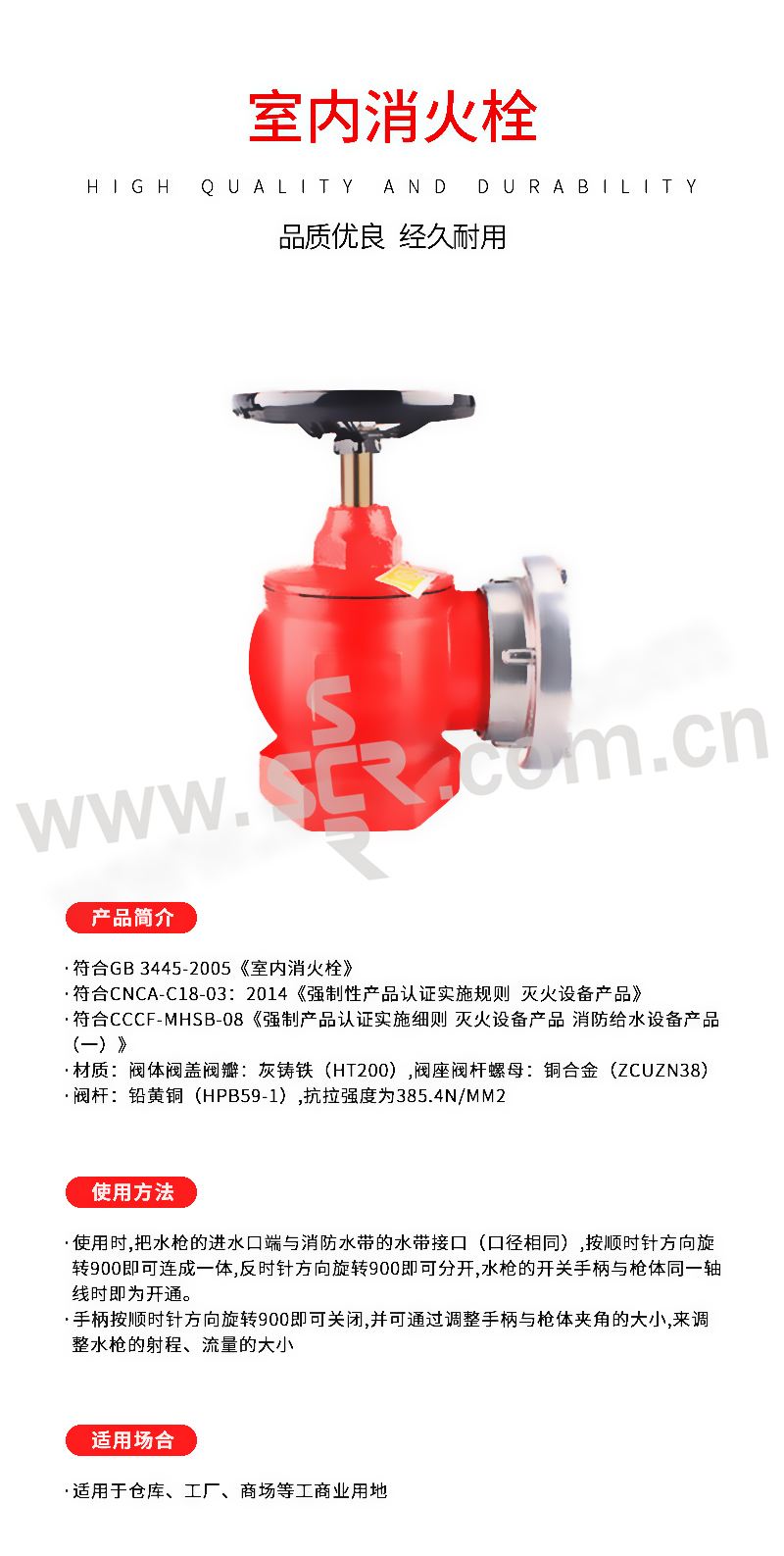 ·符合GB 3445-2005《室内消火栓》 ·符合CNCA-C18-03:2014《强制性产品认证实施规则 灭火设备产品》·符合CCCF-MHSB-08《强制产品认证实施细则 灭火设备产品 消防给水设备产品(一)》·材质:阀体阀盖阀瓣:灰铸铁(HT200),阀座阀杆螺母:铜合金(ZCuZn38)·阀杆:铅黄铜(HPb59-1),抗拉强度为385.4N/mm2