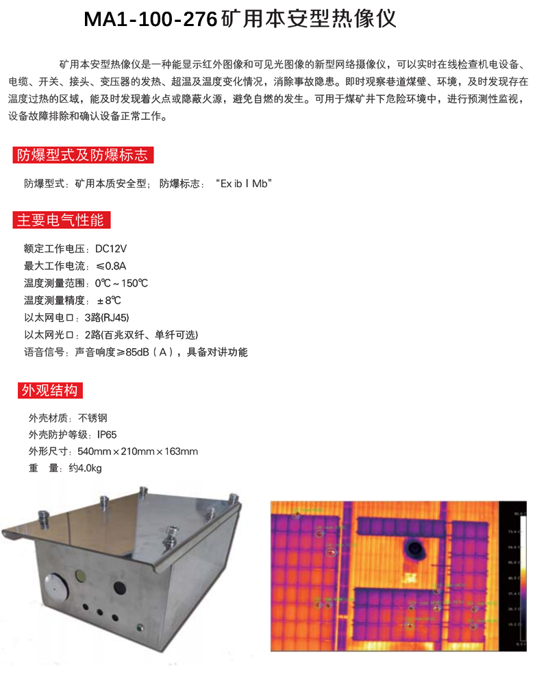 ·矿用本安型热像仪是一种能显示红外图像和可见光图像的新型网络摄像仪。可以实时在线检查机电设备、电缆、开关、接头、变压器的发热、超温及温度变化情况,消除事故隐患。即时观察巷道煤壁、环境,及时发现存在温度过热的区域,能及时发现着火点或隐蔽火源,避免自燃的发生。可用于煤矿井下危险环境中,进行预测性监视,设备故障排除和确认设备正常工作。