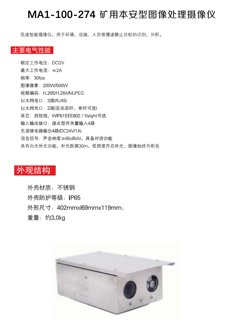 E14220 MA1-100-274 ≤2A 30fps 200W/500W 3路(RJ45) 2路(百兆双纤、单纤可选) 接点型开关量输入4路 不锈钢 IP65 402×169×119mm 约3.0kg DC12V 41250.00