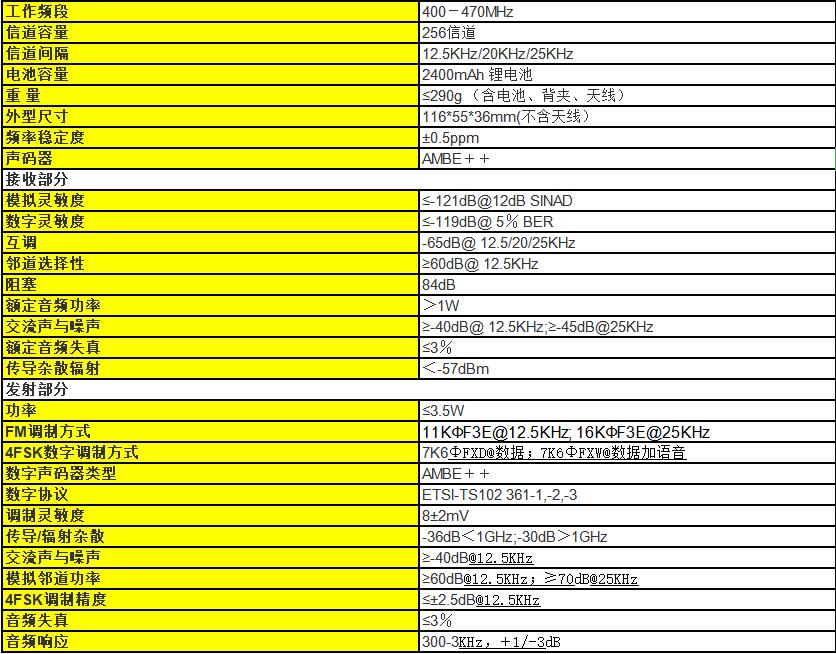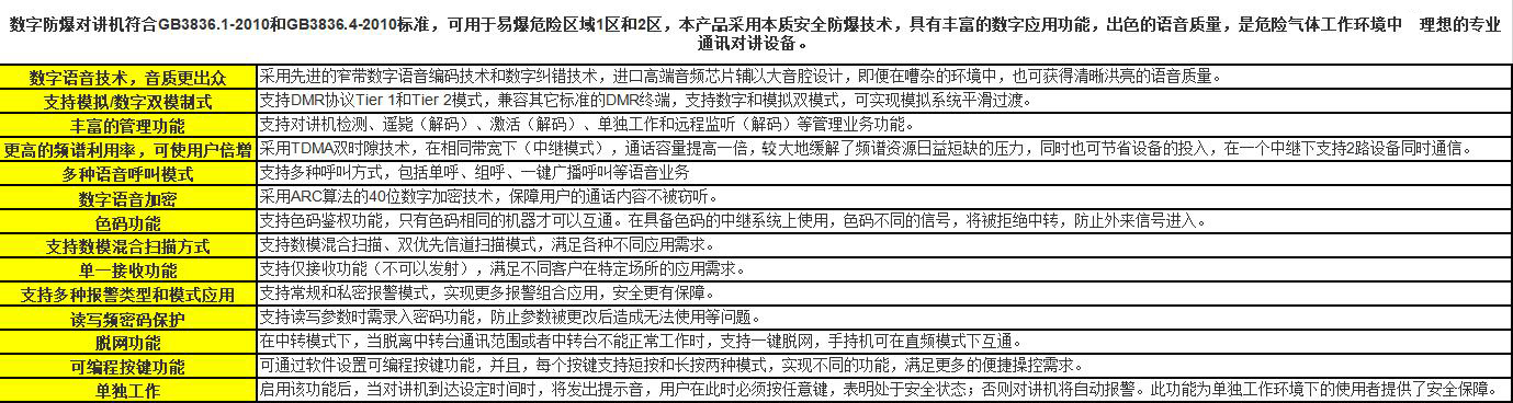 ·更精致:业界尺寸较小,重量较轻的数字防爆对讲机;更安全:本质安全电路,ⅡB级防爆等级设计;更实用:数模兼容;支持TDMA数字和模拟两种模式;更高效:2400mAH大容量高性能锂电池,低功耗设计,超长工作时间;更清晰:采用数字语音编解码技术和纠错技术,嘈杂环境,信号边缘,更显声音清晰,洪亮优势;丰富的应用功能:支持语音,数据等常规功能,支持50组CTCSS和107组CDCSS,支持对讲机检测、遥毙(解码)、激活(解码)、单独工作和远程监听(解码)等管理业务功能;保密性能高:40位数字语音加密,读写频密码保
