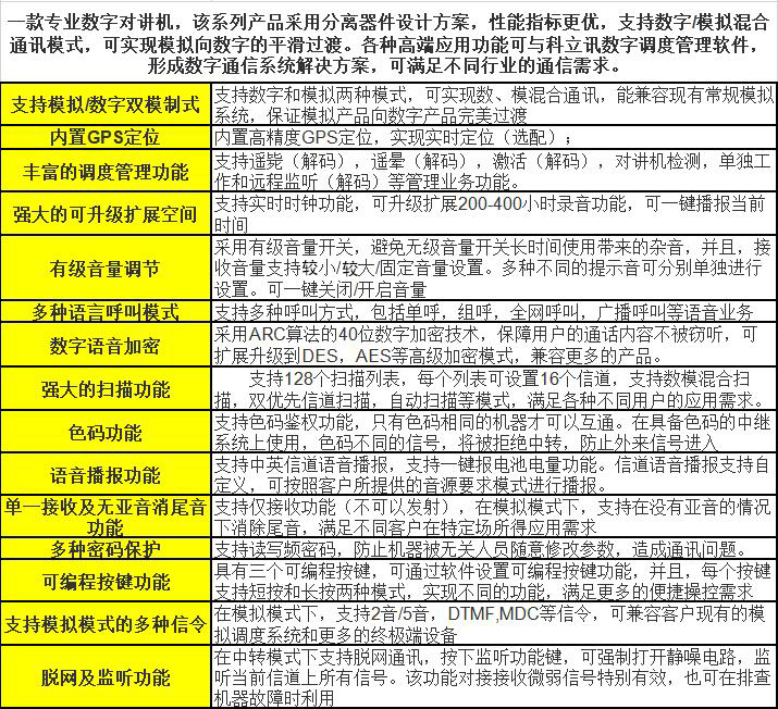 ·优异可靠的性能指标;直通双时隙技术;高精度GPS定位(选配);IP66防护等级;漫游功能;炫彩面板随心定制(DP585)语音加密,色码鉴权;内置高精度GPS定位模块,配合调度系统;可实现实时追踪定位;可选配蓝牙,倒放,漫游,虚拟集群等高端应用功能;采用有级音量开关,可自定义音量;数/模两种通讯模式,并支持数模混合通讯;支持可编程按键; 多模式紧急报警及远程管理控制功能