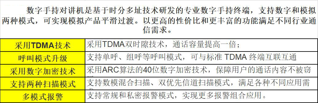 ·采用TDMA双时隙技术,通话容量提高一倍;支持单呼、组呼等呼叫模式,可与标准 TDMA 终端互联互通;支持对讲机检测,摇毙,激活和远程监听等管理业务功能;采用ARC算法的40位数字加密技术,保障用户的通话内容不被窃听;支持数模混合扫描、双优先信道扫描模式,满足各种不同应用需求;支持常规和私密报警模式,实现更多报警组合应用。数字语音技术,音质更出众;兼容其他标准TDMA数字终端;支持中转模式下两路信号同时通讯;支持色码鉴权;大容量电池,超长待机;可扩展升级到直通双时隙等高端应用功能