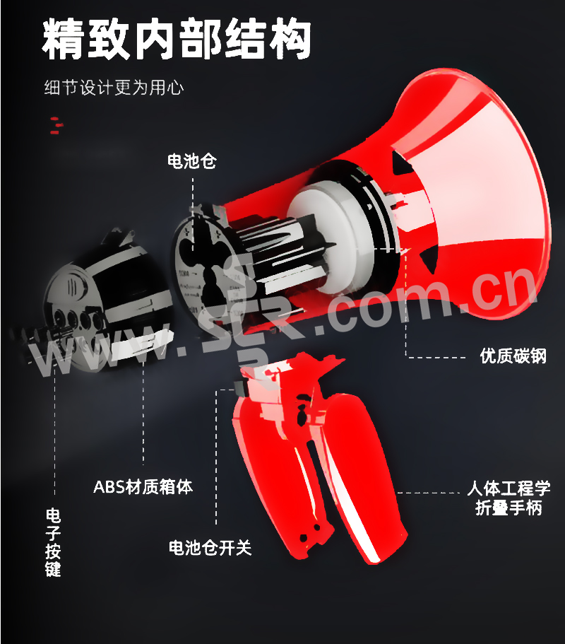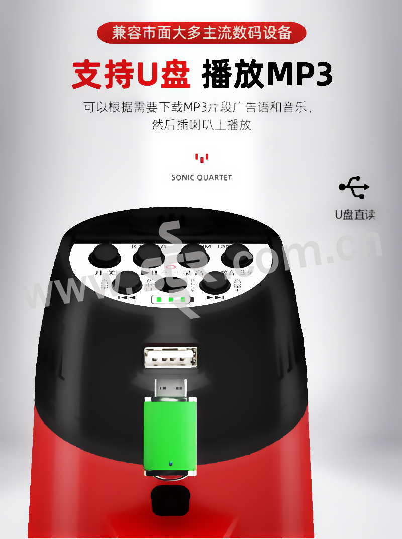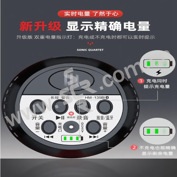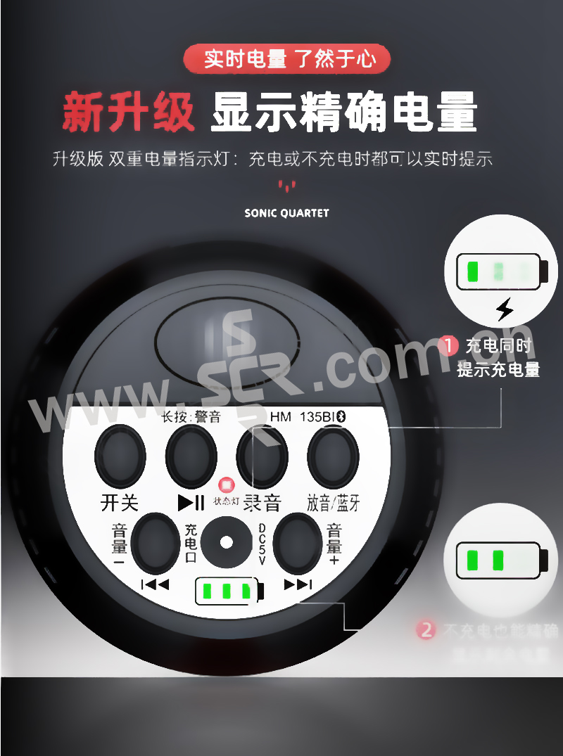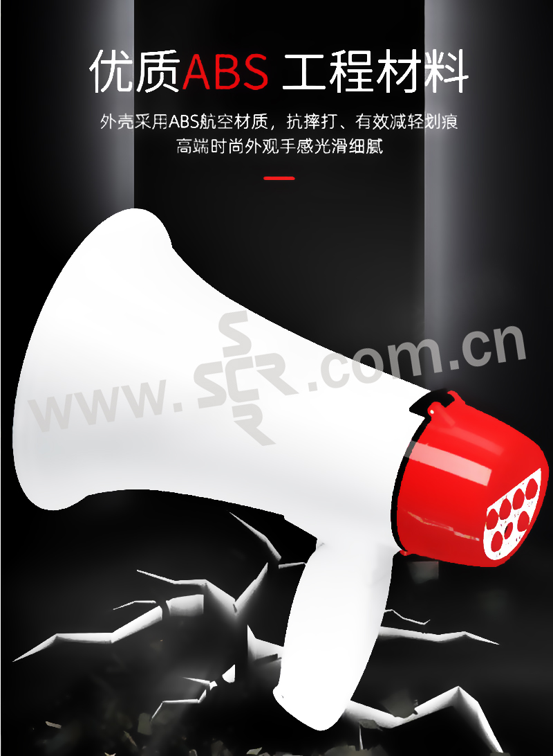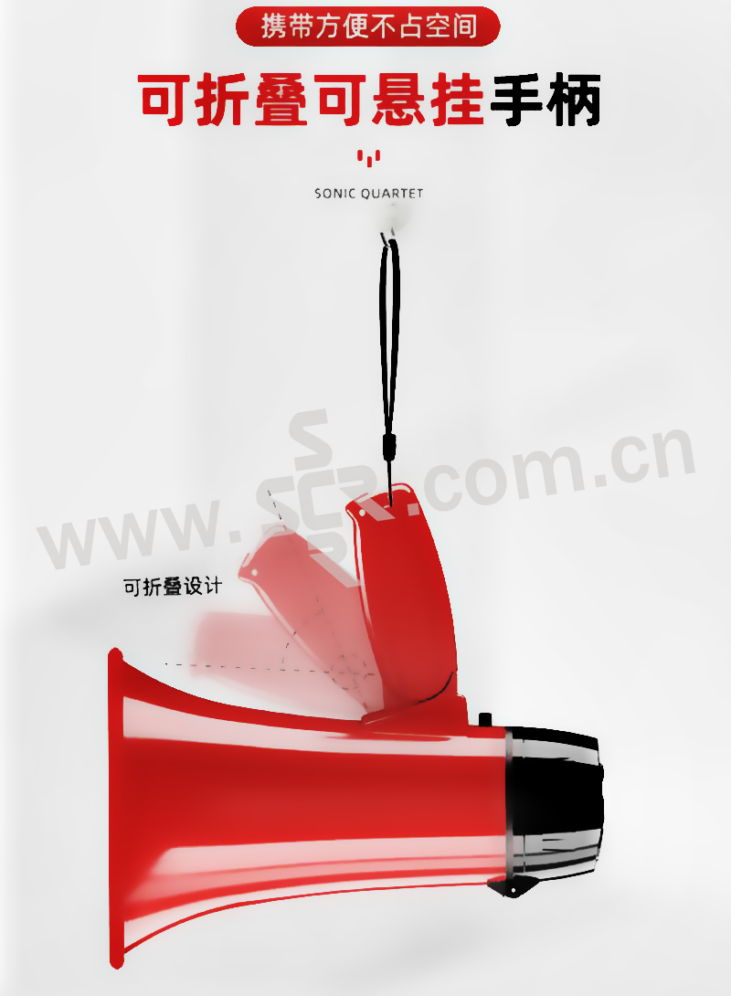 ·具有扩音、录音、警报、支持蓝牙连接、U盘插入、音乐播放,电量显示功能等,使用方便·高强度ABS工程塑料外壳,坚固耐用·35W大功率,传播距离远·手柄可折叠设计方便携带·锂电池供电模式,支持充电反复使用