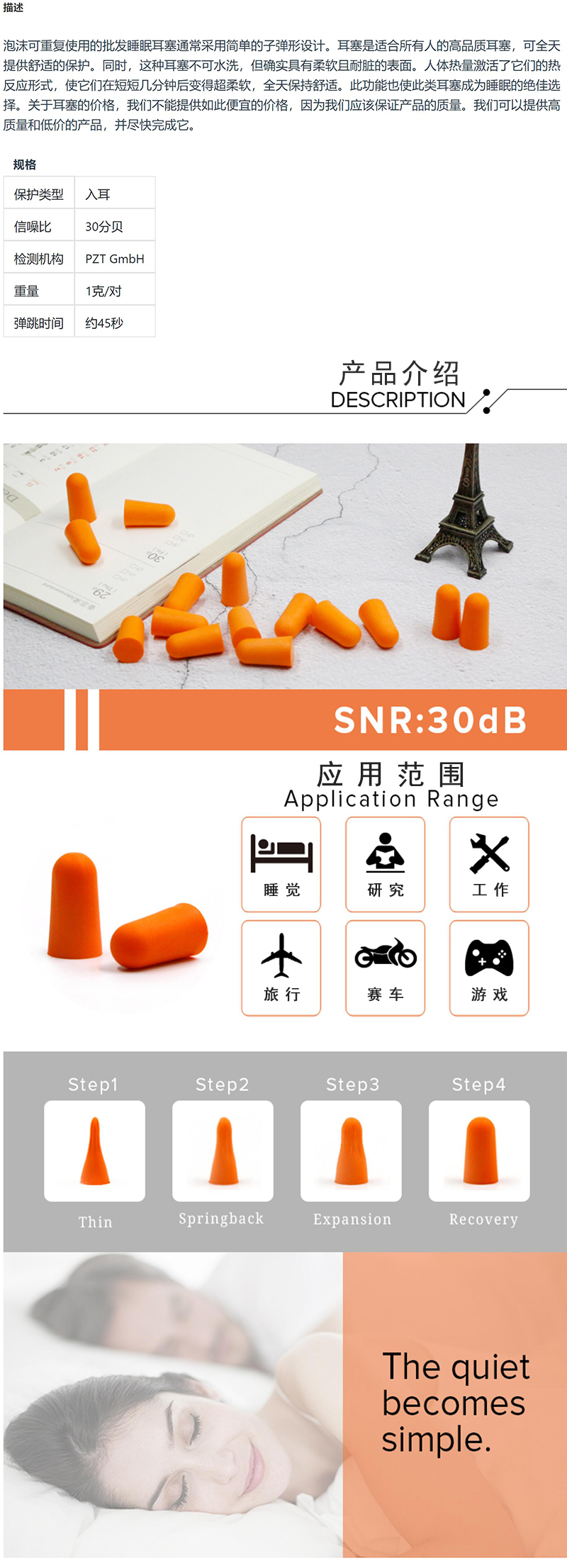 ·泡沫可重复使用的批发睡眠耳塞通常采用简单的子弹形设计。耳塞是适合所有人的高品质耳塞,可全天提供舒适的保护。同时,这种耳塞不可水洗,但确实具有柔软且耐脏的表面。人体热量激活了它们的热反应形式,使它们在短短几分钟后变得超柔软,全天保持舒适。此功能也使此类耳塞成为睡眠的绝佳选择。