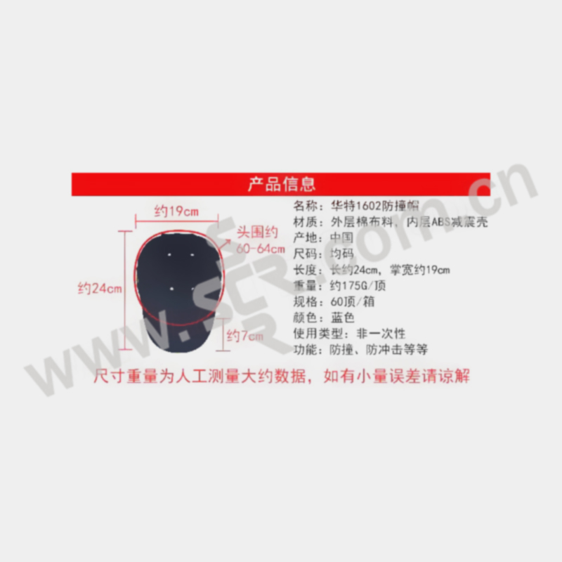 HT/华特 防撞帽 1602 蓝色 帽檐长7cm 长24cm 掌宽19cm 头围60~64cm 175g 1顶