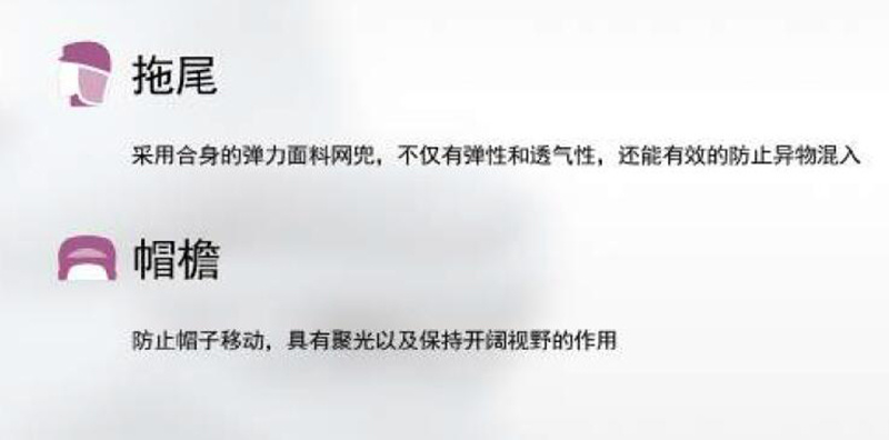 ·拖尾 ·采用合身的弹力面料问览,不仅有弹性和透气性,还能有效的防止异物混入 ·帽檐 ·防止帽子移动,具有聚光以及保持开词报野的怍用