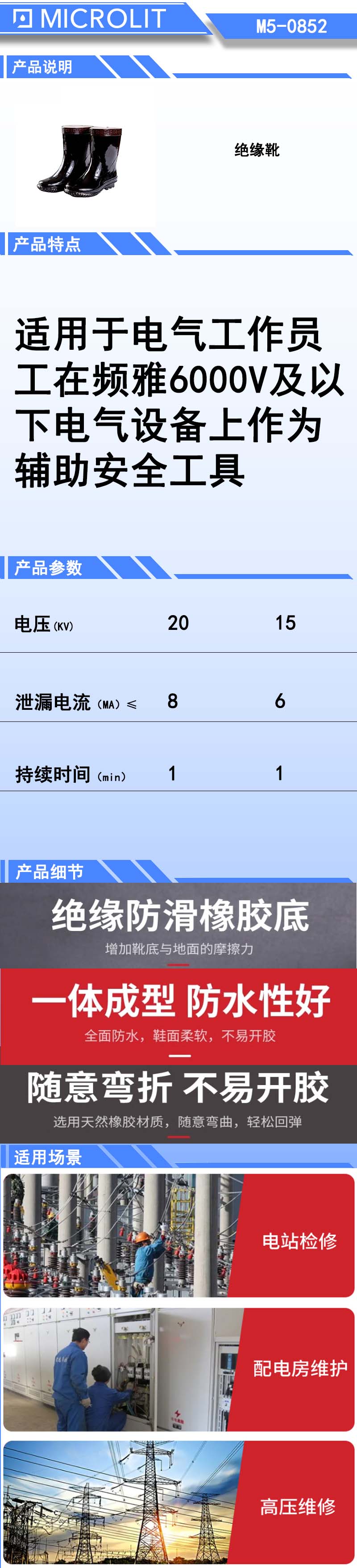 * 耐磨舒适 、安全绝缘、防水防滑 * 进口橡胶材质,安全绝缘,进口橡胶,柔软轻便抗拉,耐磨不易变形。 * 采用棉布内里更加牢固耐穿,吸汗清爽减少与外层绝缘的摩擦提高舒适度 * 防滑大底鞋型流畅穿戴舒适,安全可靠,新工艺加工增大鞋底与地面摩擦耐磨防滑