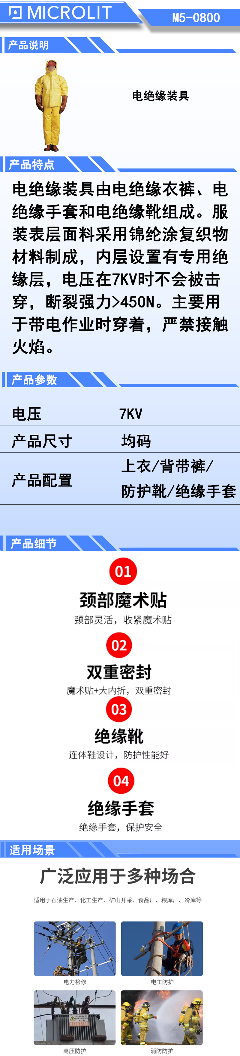 电绝缘装具由电绝缘衣销、电绝缘手套和电绝缘靴组成。服装表层面料采用锦纶涂复织物材料制成,内层设置有专用绝缘层,电压在7KV时不会被击穿 ,断裂强力>450N。主要用于带电作业时穿着,严禁接触火焰。