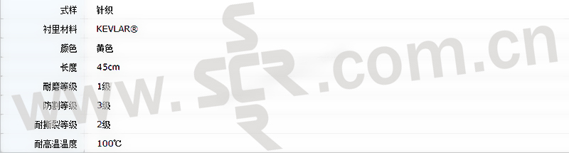 · KEVLAR® 防割耐热护臂· 长度45厘米· 双层KEVLAR® 编织护臂,符合欧标EN388 3 级防割标准· 接触热防护达到100°C· 大拇指处留有指孔·产品设计用来保护工作人员的手掌和前臂免受割伤的危害