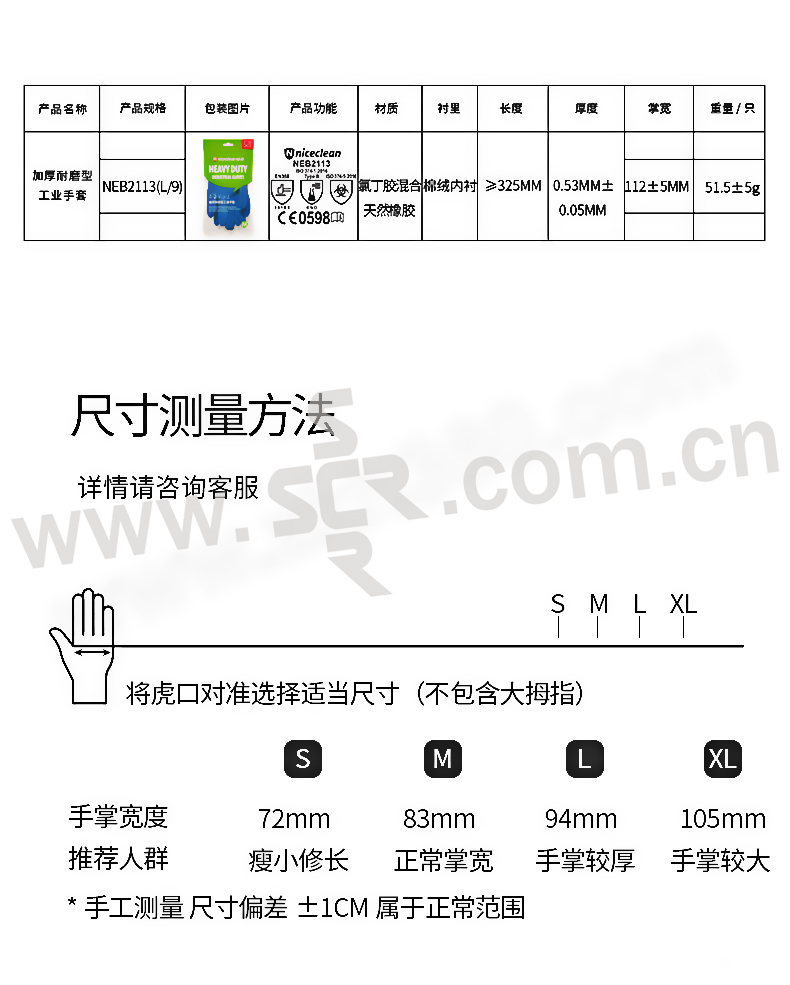 NICECLEAN/好清 加厚耐磨型工业手套 NEB2113 L(9) 102±5g 氯丁胶混+天然橡胶 棉绒内衬 1双