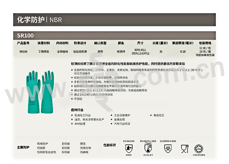 ·欧标耐磨最高等级4级,欧标防化A级认证,防护微生物,防静电测试认证,食品可接触,全棉植绒内衬,钻石纹防滑;全棉植绒内衬,长度33厘米,掌部厚度0.38毫米