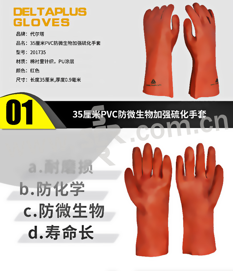 DELTA/代尔塔 加强硫化防微生物PVC防化手套 201735 10码 1副