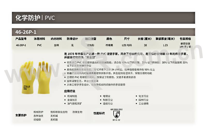 ·中国第一款PVC浸塑手套,畅销40年,耐酸碱性能出众,性价比高;全棉内衬,长度28厘米可选,掌部厚度1.23毫米