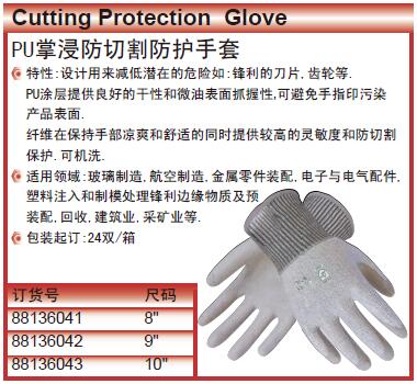 ·特性:设计用来减低潜在的危险如:锋利的刀片,齿轮等.PU涂层提供良好的干性和微油表面抓握性,可避免手指印污染产品表面.