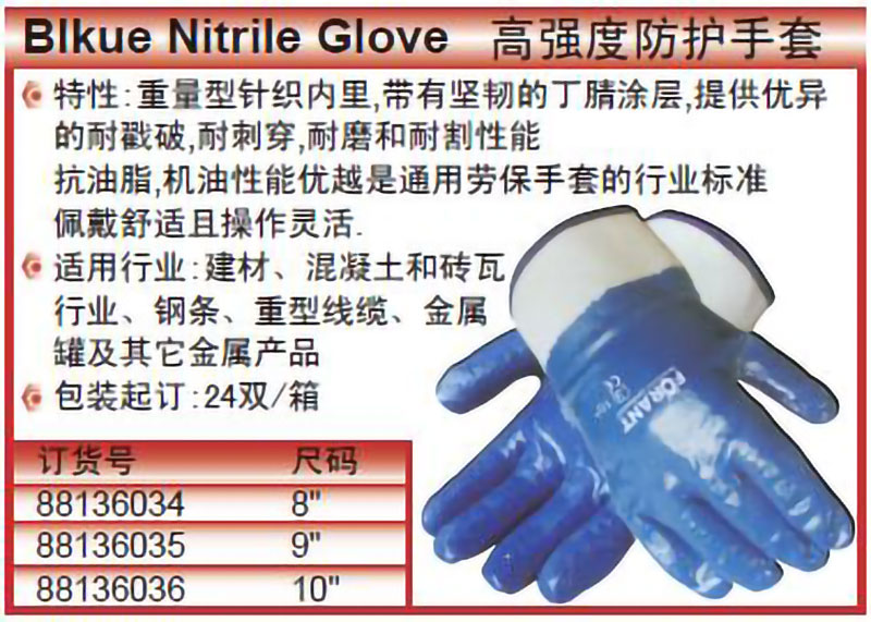 ·特性:重量型针织内里,带有坚韧的丁腈涂层,提供优异的耐戳破,耐刺穿,耐磨和耐割性能抗油脂,机油性能优越是通用劳保手套的行业标准佩戴舒适且操作灵活.