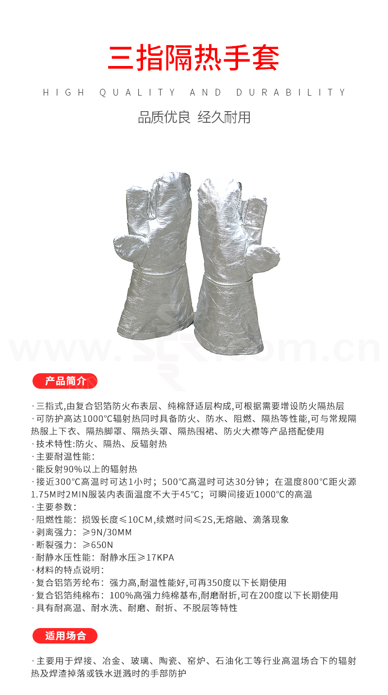 ·三指式,由复合铝箔防火布表层、纯棉舒适层构成,可根据需要增设防火隔热层·可防护高达1000℃辐射热同时具备防火、防水、阻燃、隔热等性能,可与常规隔热服上下衣、隔热脚罩、隔热头罩、隔热围裙、防火大襟等产品搭配使用·技术特性:防火、隔热、反辐射热·主要耐温性能:·能反射90%以上的辐射热·接近300℃高温时可达1小时;500℃高温时可达30分钟;在温度800℃距火源1.75m时2min服装内表面温度不大于45℃;可瞬间接近1000℃的高温·主要参数:·阻燃性能:损毁长度≤10cm,续燃时间≤2S,无熔融、滴落现象·剥离强力:≥9N/30mm·断裂强力:≥650N·耐静水压性能:耐静水压≥17KPa·材料的特点说明:·复合铝箔芳纶布:强力高,耐温性能好,可再350度以下长期使用·复合铝箔纯棉布:100%高强力纯棉基布,耐磨耐折,可在200度以下长期使用·具有耐高温、耐水洗、耐磨、耐折、不脱层等特性
