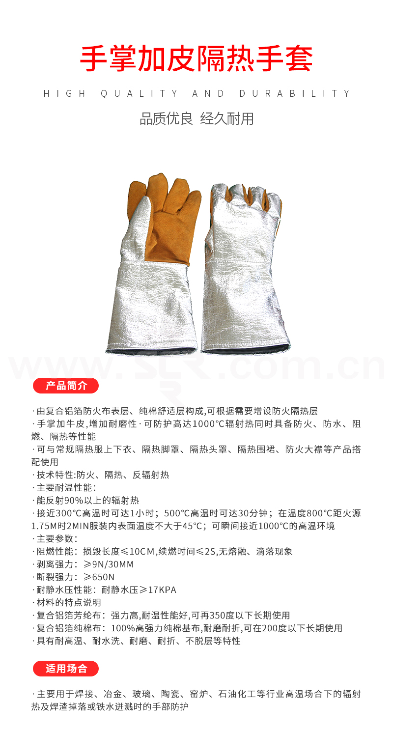·由复合铝箔防火布表层、纯棉舒适层构成,可根据需要增设防火隔热层·手掌加牛皮,增加耐磨性·可防护高达1000℃辐射热同时具备防火、防水、阻燃、隔热等性能·可与常规隔热服上下衣、隔热脚罩、隔热头罩、隔热围裙、防火大襟等产品搭配使用·技术特性:防火、隔热、反辐射热·主要耐温性能:·能反射90%以上的辐射热·接近300℃高温时可达1小时;500℃高温时可达30分钟;在温度800℃距火源1.75m时2min服装内表面温度不大于45℃;可瞬间接近1000℃的高温环境·主要参数:·阻燃性能:损毁长度≤10cm,续燃时间≤2S,无熔融、滴落现象·剥离强力:≥9N/30mm·断裂强力:≥650N·耐静水压性能:耐静水压≥17KPa·材料的特点说明·复合铝箔芳纶布:强力高,耐温性能好,可再350度以下长期使用·复合铝箔纯棉布:100%高强力纯棉基布,耐磨耐折,可在200度以下长期使用·具有耐高温、耐水洗、耐磨、耐折、不脱层等特性