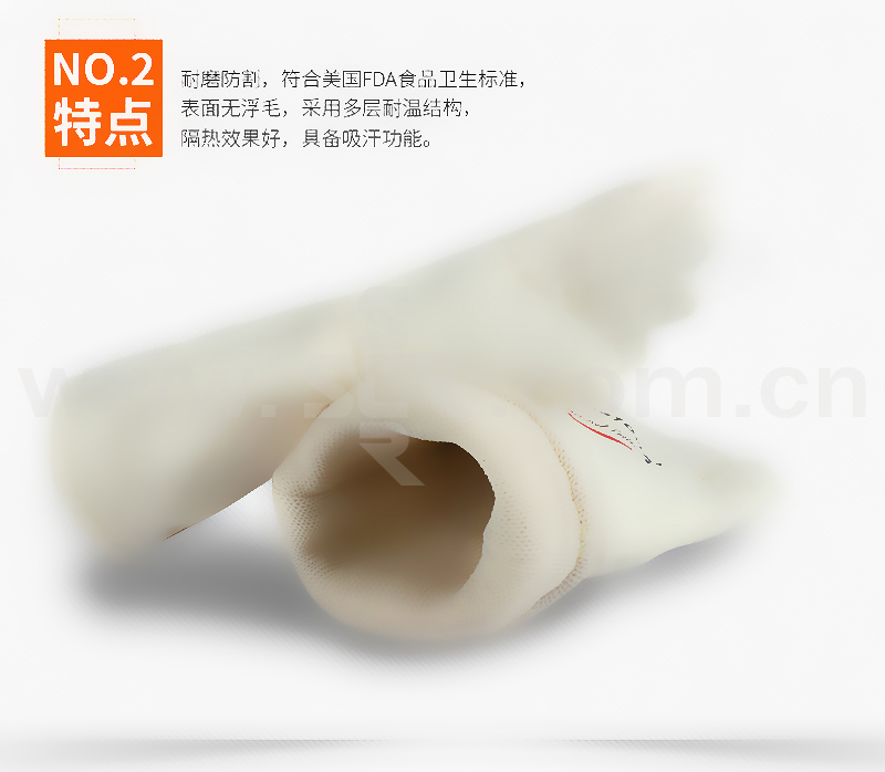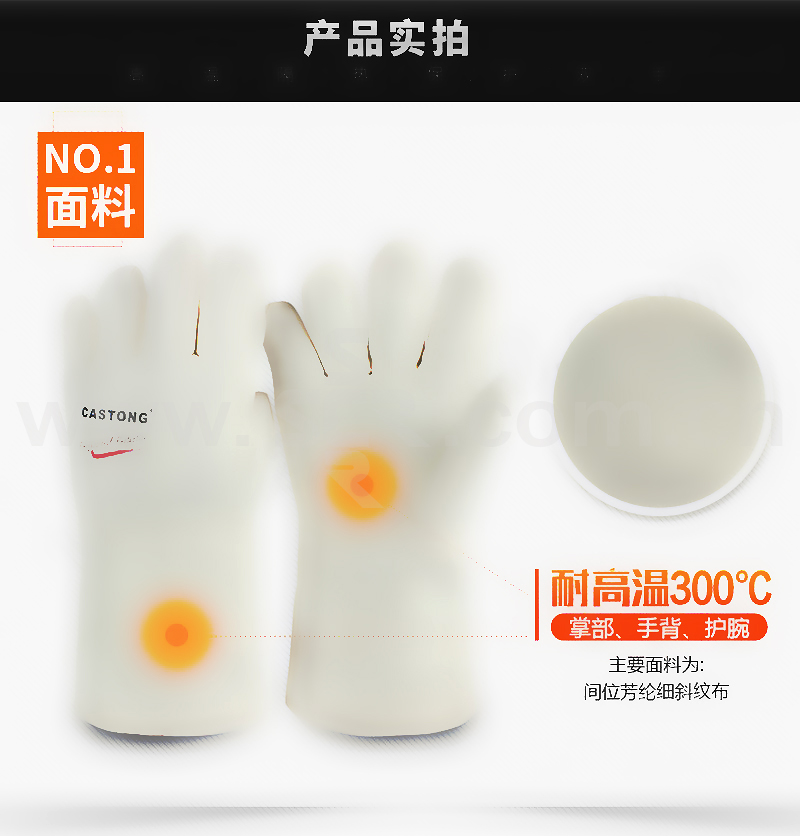 ·主要面料为间位芳纶(Meta Aramid)细斜纹布,耐温300℃,持续时间25-30秒,防割且耐磨,手型舒适灵活