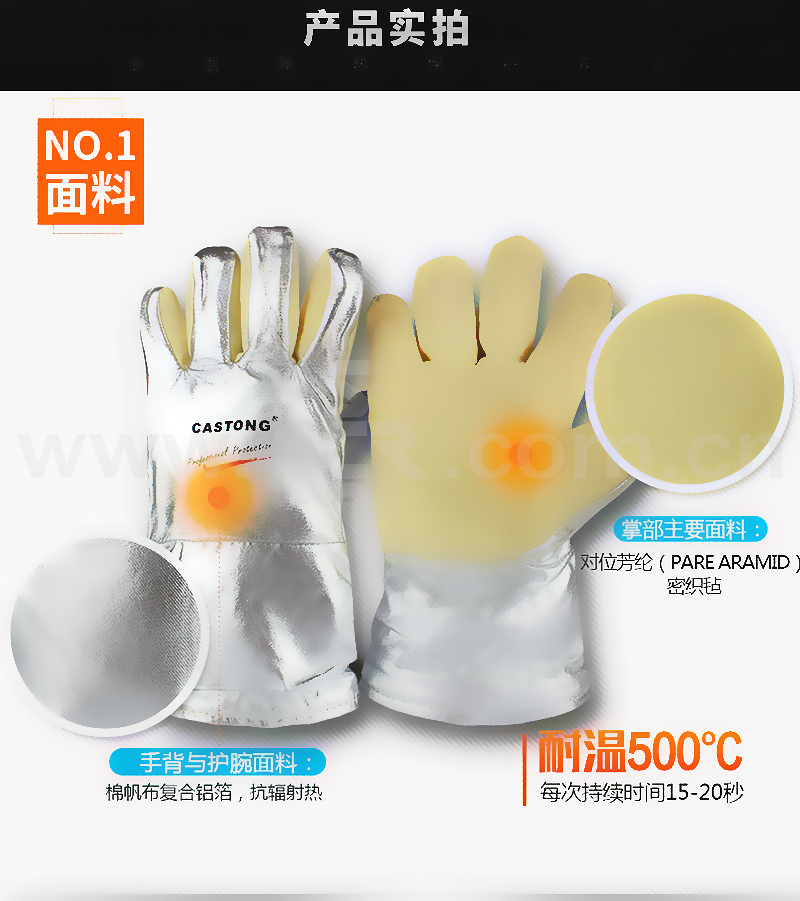 ·耐500°高温·长度:34CM·颜色:土黄色·灵活度:3级·主要面料为对位芳纶(Meta Aramid)密织毡,耐温500℃,每次持续时间15-20秒,有一定的防割和耐磨性能,磨损后有少量浮毛,手型舒适灵活·背部及腕部主要面料为棉帆布复合铝箔,防辐射热,抗撕裂和褶皱,耐温500℃辐射热,每次持续时间10-15秒·表面光滑,能有效防止金属火星飞溅和热辐射