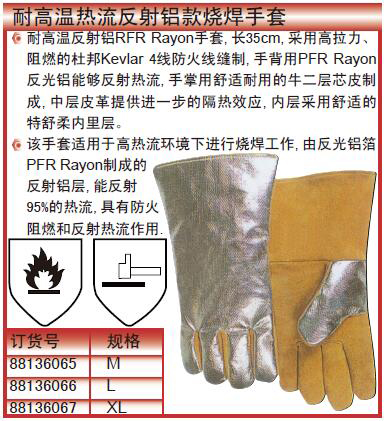 ·采用高拉力、阻燃的杜邦Kevlar 4线防火线缝制,手背用PFR Rayon反光铝能够反射热流,手掌用舒适耐用的牛二层芯皮制成 ·中层皮革提供进一步的隔热效应,内层采用舒适的特舒柔内里层。 ·该手套,由反光铝箔PFR Rayon制成的反射铝层,能反射95%的热流,具有防火阻燃和反射热流作用.