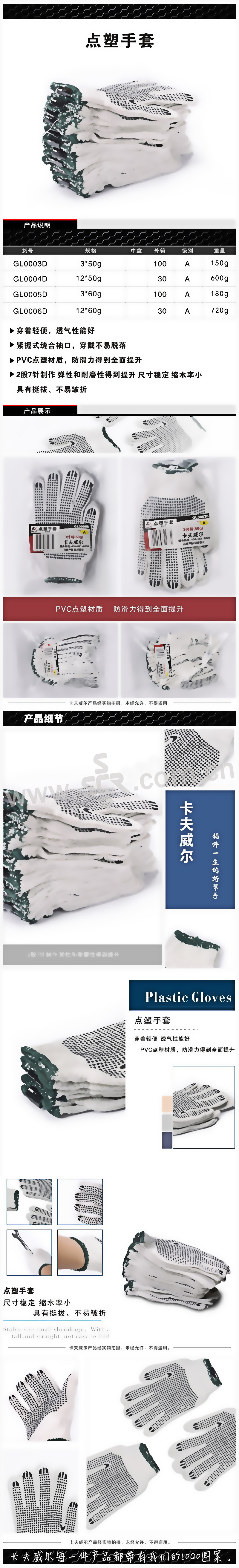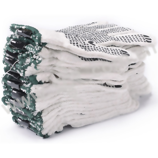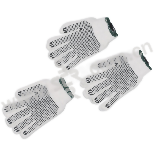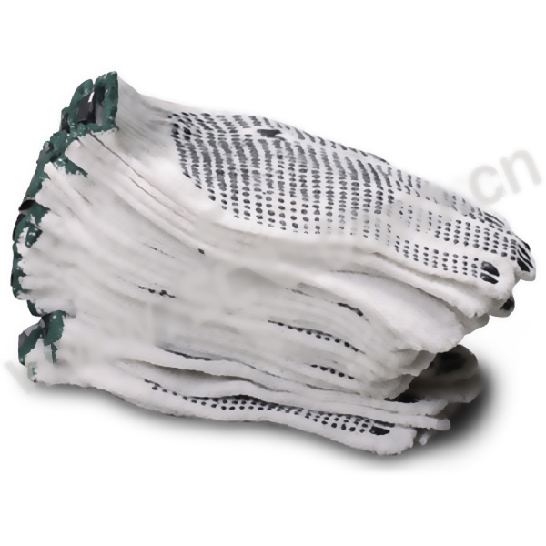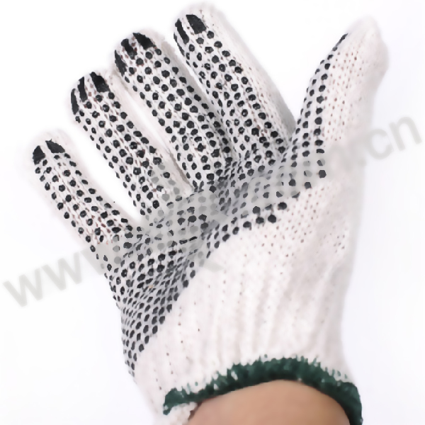 ·点塑手套棉纱,7针,掌心有黑色防滑点塑,不易漏针,不易破损,有良好的防护作用,透气性好。