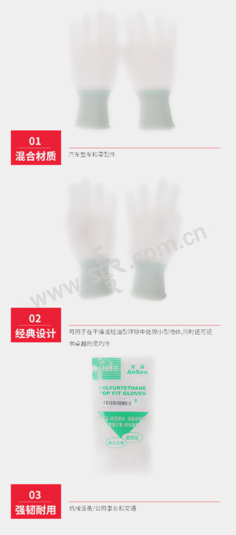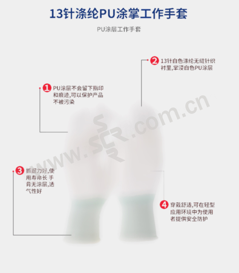 ·13针白色涤纶无缝针织衬里,掌浸白色PU涂层·PU涂层不会留下指印和痕迹,可以保护产品不被污染·抓握力好,使用寿命长 手背无涂层,透气性好·穿戴舒适,可在轻型应用环境中为使用者提供安全防护·可用于在干燥或轻油型环境中处理小型物体,同时还可提供卓越的灵巧性