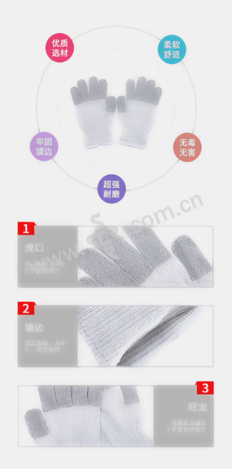 ·手套上使用的导电丝线采用了硫化铜复合纤维材料,防止在作业过程中因为摩擦以及接触产生静电。·尤其需要非常高的导电性的手指尖部位,只使用导电丝线进行编制。·采用长纤维精制而成,可以防止手套产生灰尘或者丝线屑对产品造成污染。