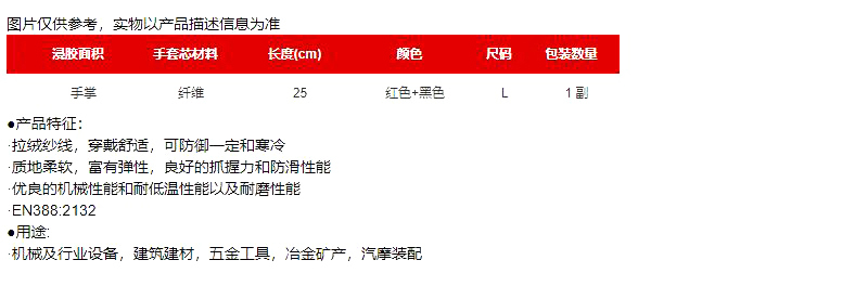 ·拉绒纱线,穿戴舒适,可防御一定和寒冷 ·质地柔软,富有弹性,良好的抓握力和防滑性能 ·优良的机械性能和耐低温性能以及耐磨性能 ·EN388:2132
